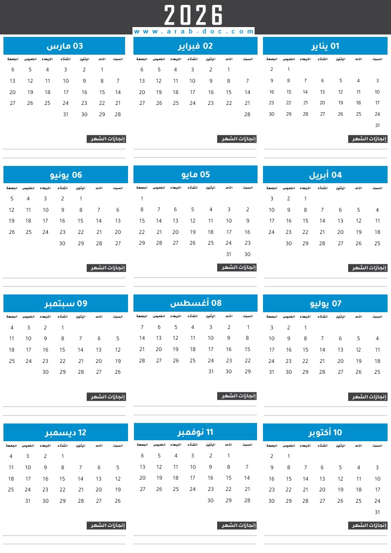 هذا التقويم يتكون من لونين بشكل جميل وهو منقسم على حسب الأشهر تعطي إشراق وبهجة للمكان. كل ما عليكم هو طبعه سواء على ملصقة للمكتب أو كتابكم المفضل ولما لا على مذكرتكم الخاصة بسنة 2026. كما تتضمن هذه أجندة العربية فكرة جميلة وهي 8 عوارض خاصة بكل شهر وذلك للتدوين الإنجازات الخاصة بكم أو الأهداف المراد تحقيقها، وبهذا الشكل ستكون طبعا أنت أكثر إنتاجية من دي قبل.
