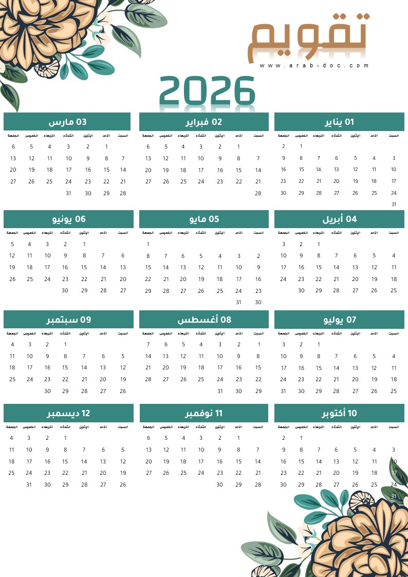 يعتبر هذا التقويم من أفضل الأمثلة العربية لسنة 2026 الذي هو بجودة جيدة ومجانية الإستخدام ، نعمل على إنشاء النماذج بحجم أخف، وكذلك ألوان متناسقة وزخرفة رائعة تعطي جمالية أكثر للمكان الخاص بكم.